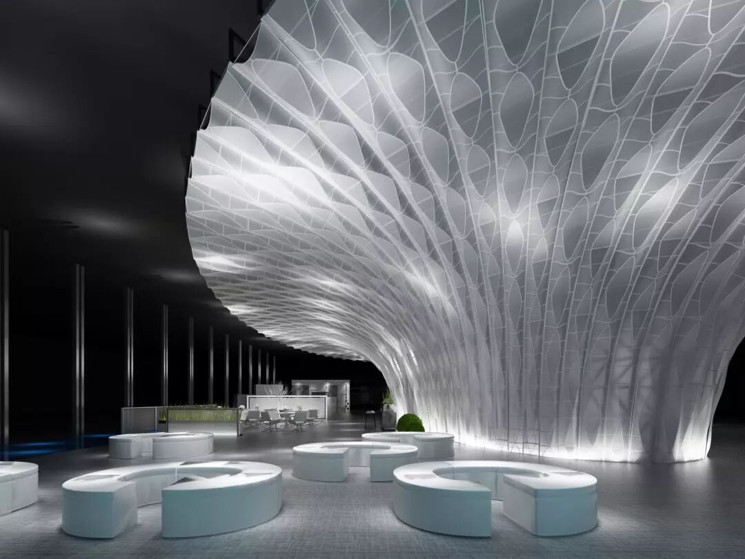 展位设计中的主体造型采用船体构造技法,用全钢结构打造,以树的形态和波涛纹理为基础造型。